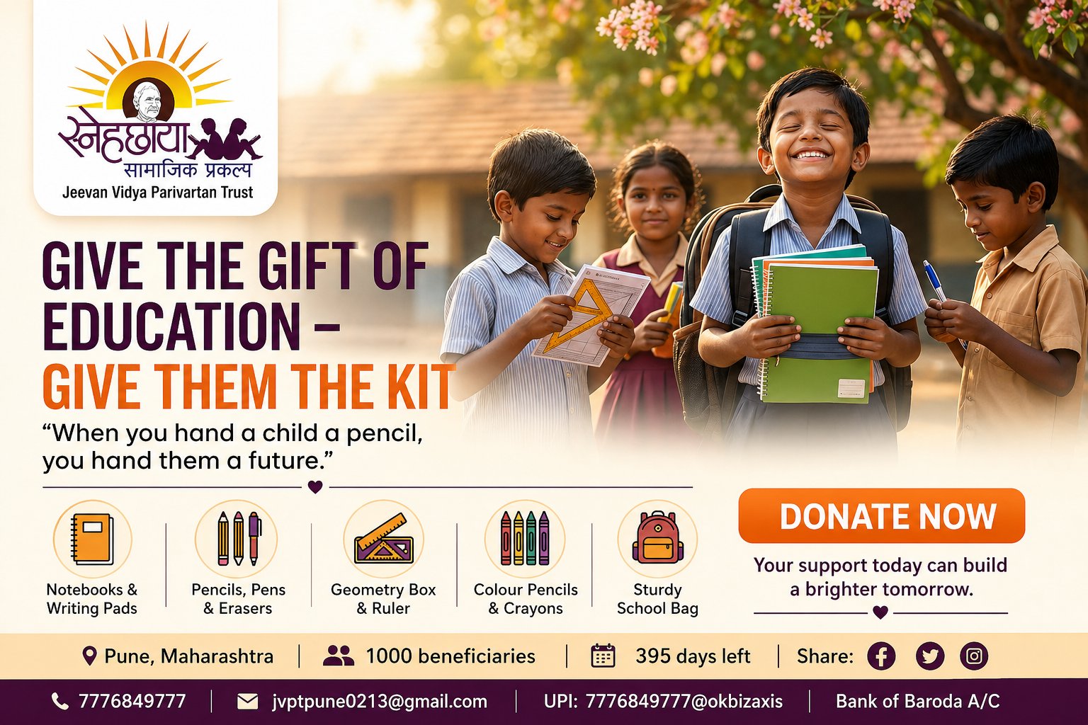 0%Every child deserves the chance to learn, grow, and dream. Through our Donate School Kit initiative, we provide essential educational supplies to underprivileged and orphan children across India, ensuring no child is left behind due to poverty.